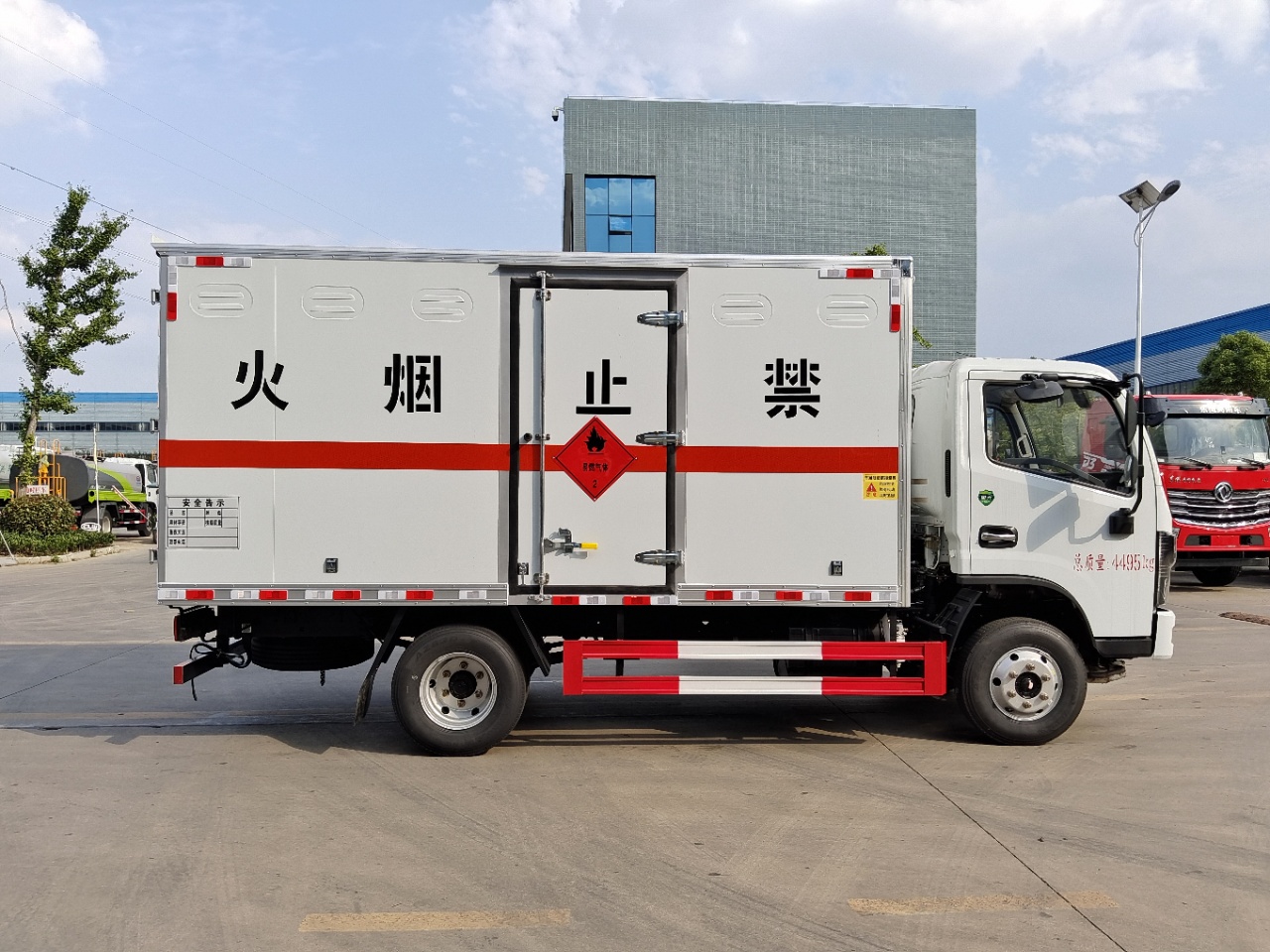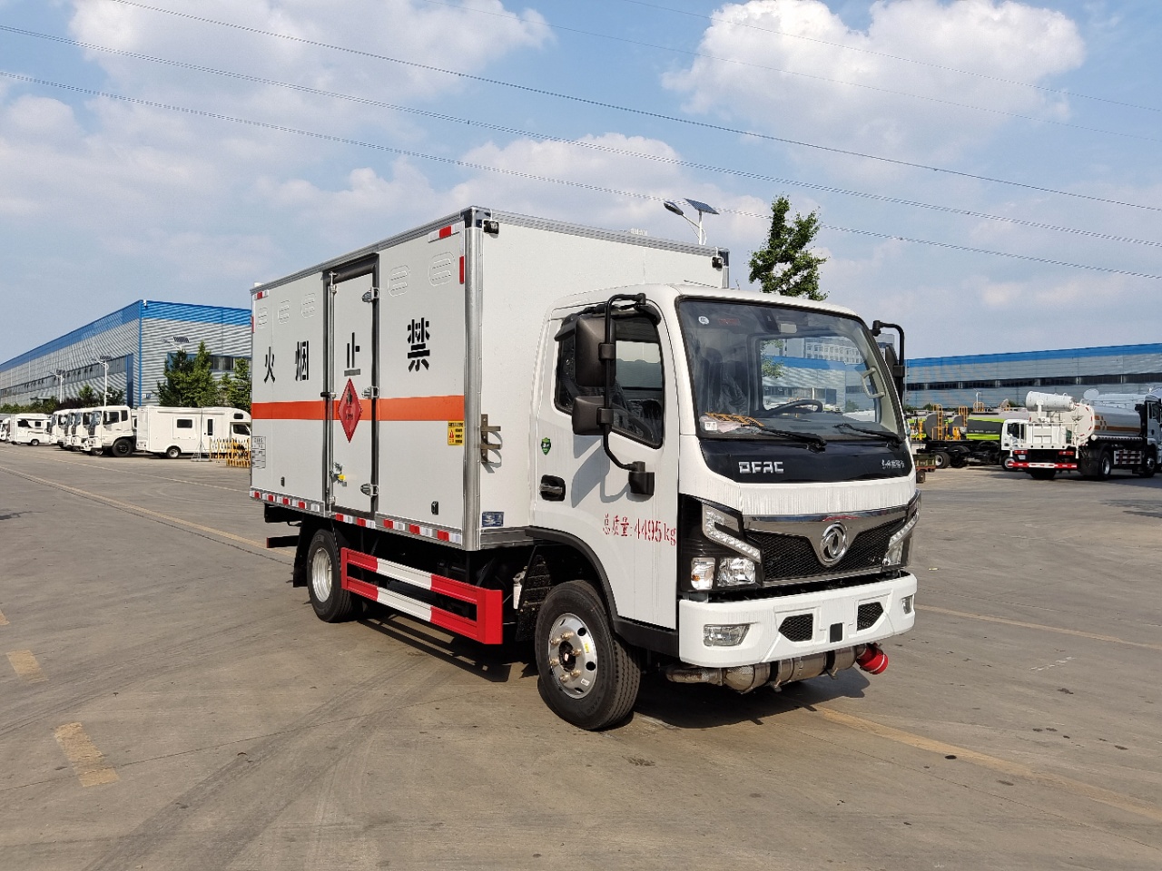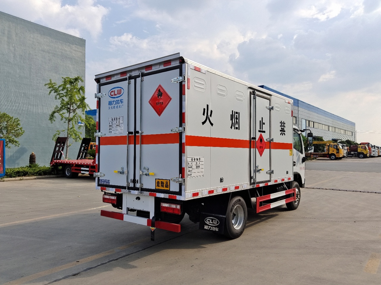 | 貨箱配置 | 廂體為雙層金屬骨架結構,外板采用冷軋鋼板,中間填充阻燃泡沫,內飾為鋁板。底板為平板上鋪防靜電膠皮。廂內兩側加裝固定貨物臥環(huán),門框帶防盜報警器,頂部帶煙霧報警器,廂體右側選裝側門,隨車配2個滅火器,危險標志牌,防火帽,危險品三角頂燈。(也可用瓦楞板) | ||