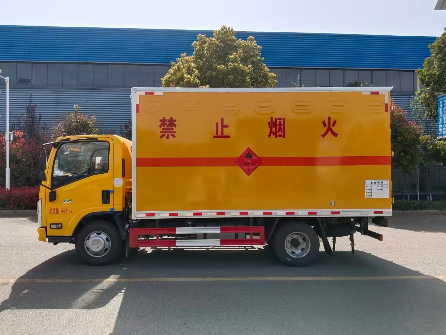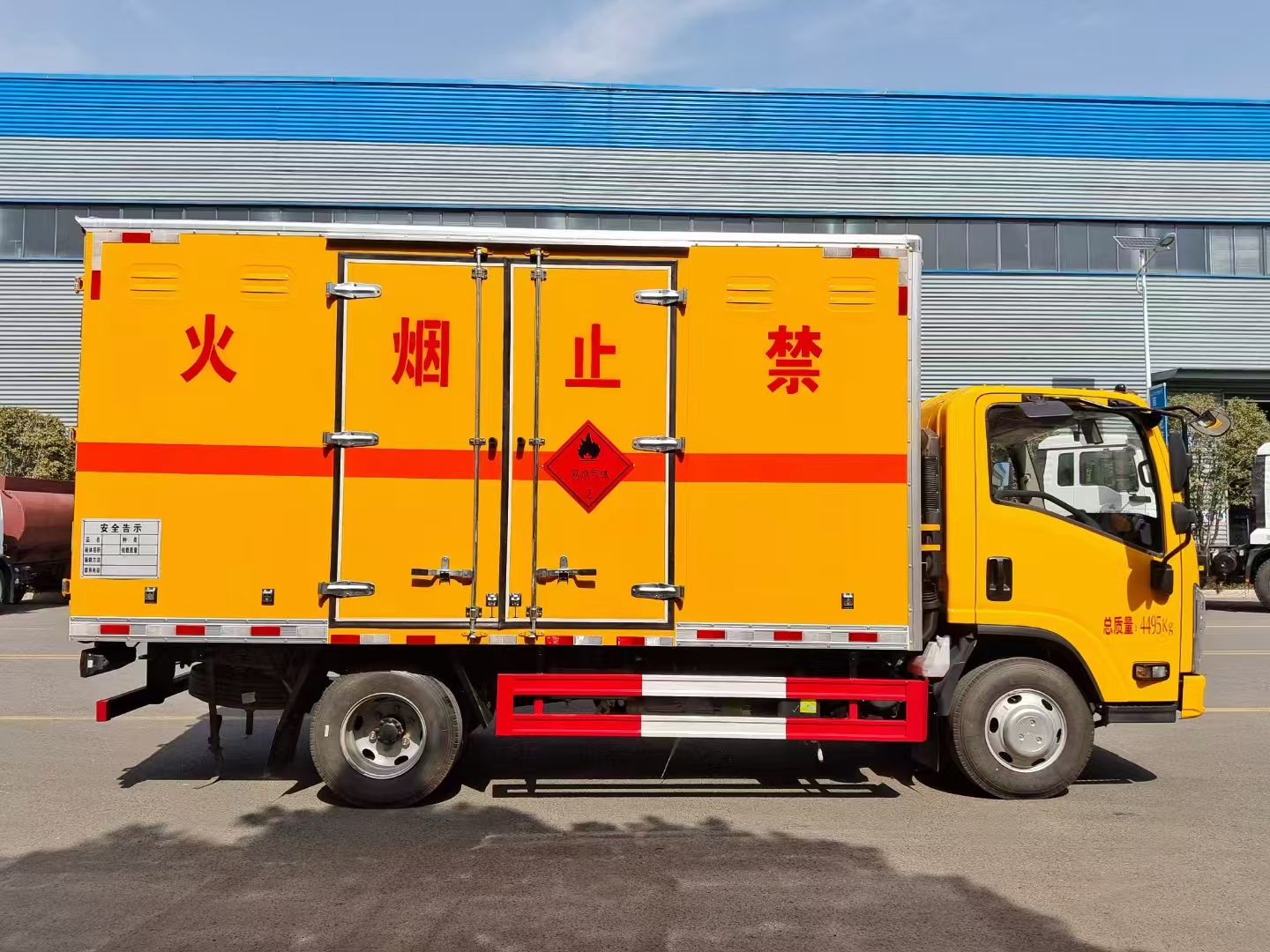| 貨箱配置 | 廂體為雙層金屬骨架結(jié)構(gòu),外板采用冷軋鋼板,中間填充阻燃泡沫,內(nèi)飾為鋁板。底板為平板上鋪防靜電膠皮。廂內(nèi)兩側(cè)加裝固定貨物臥環(huán),門(mén)框帶防盜報(bào)警器,頂部帶煙霧報(bào)警器,廂體右側(cè)選裝側(cè)門(mén),隨車(chē)配2個(gè)滅火器,危險(xiǎn)標(biāo)志牌,防火帽,危險(xiǎn)品三角頂燈。 (選裝瓦楞板貨箱) (尾部可選裝液壓升降尾板) | ||
