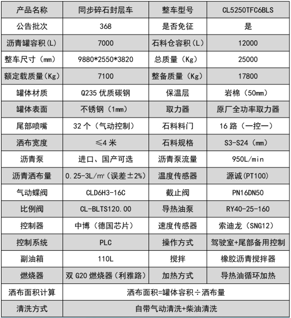 ??????湖北程力汽車:程力CL5250TFC6BLS型陜汽德龍后八輪瀝青同步碎石封層車產品型號及參數配置,程力CL5250TFC6BLS型陜汽德龍后八輪瀝青同步碎石封層車高清圖片,程力汽車系列程力CL5250TFC6BLS型陜汽德龍后八輪瀝青同步碎石封層車最新報價請撥打客服熱線。車輛主要配置 產品商標 程力牌 公告批次 372(擴展) 產品名稱 同步碎石封層車 產品型號 CL5250TFC6BLS 總質量(Kg) 25000 罐體容積(m3) 額定載質量(Kg) 7070 外形尺寸(mm) 9900 × 2550 × 3820 整備質量(Kg)...