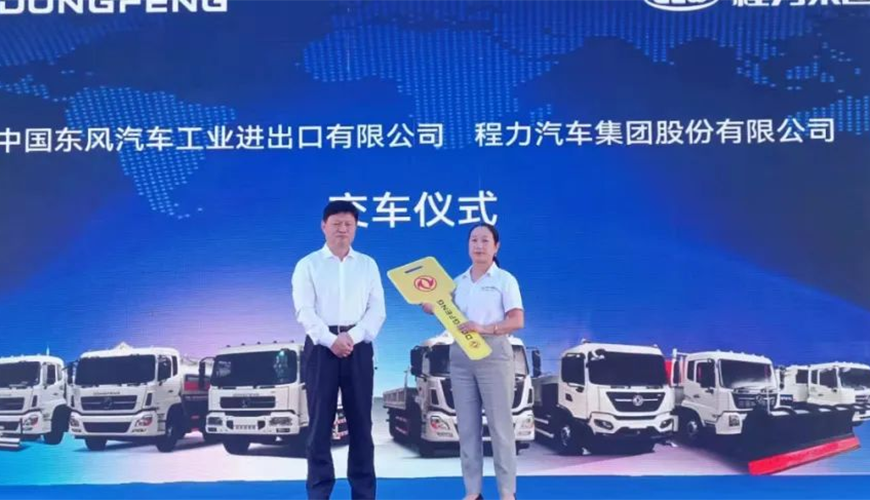 隨后,中國東風汽車工業(yè)進出口有限公司商用車海外營銷部中重型產(chǎn)品總監(jiān)吳永剛與程力集團國際市場部業(yè)務經(jīng)理陳葦舉行了交車鎖匙牌授牌儀式。