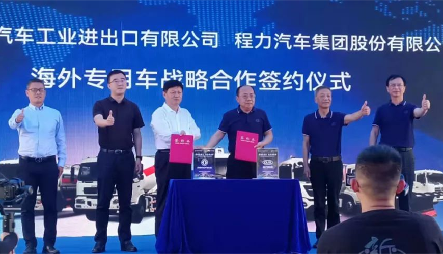 在這次線下大型東風商用車海外市場新產(chǎn)品推薦會上,中國東風汽車工業(yè)進出口有限公司與程力汽車集團股份有限公司聯(lián)合舉行了海外專用車戰(zhàn)略合作簽約儀式,雙方高層領(lǐng)導簽約后合影紀念。