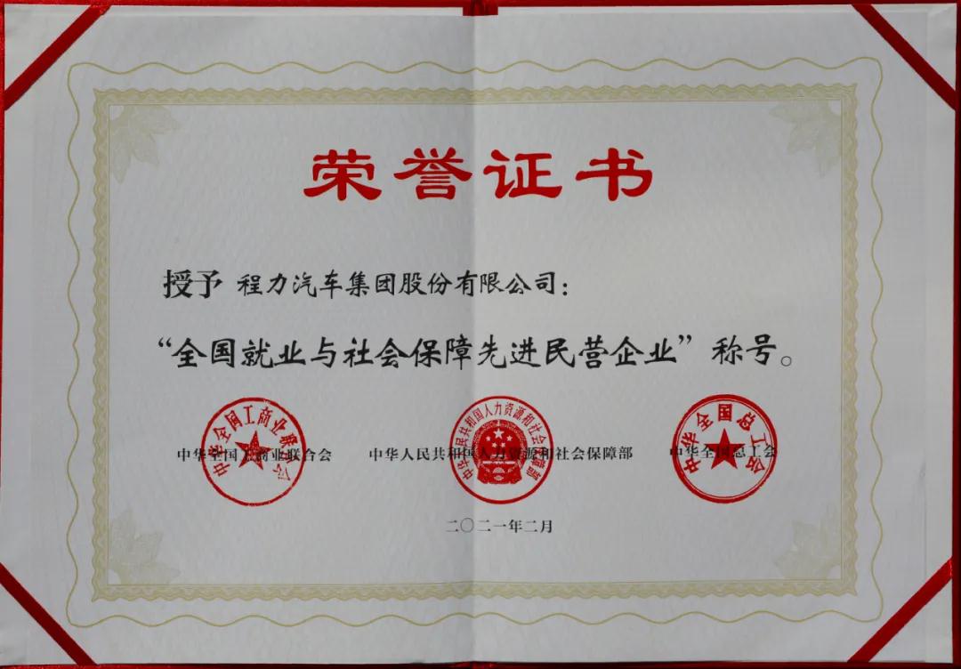 3月2日,程力汽車集團(tuán)股份有限公司收到國家人力資源和社會(huì)保障部、中華全國工商業(yè)聯(lián)合會(huì)、中華全國總工會(huì)聯(lián)合頒發(fā)的“全國就業(yè)與社會(huì)保障先進(jìn)民營企業(yè)”榮譽(yù)證書及牌匾,這是程力汽車集團(tuán)股份有限公司在2021年初被授予的開門紅全國性殊榮,也是程力集團(tuán)繼2020年連續(xù)三次受到全國性榮譽(yù)表彰。