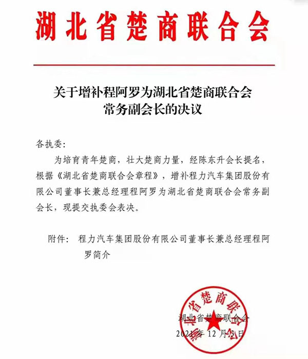 “虎威熠熠踏征程,八面來風共聚首”,程阿羅總經(jīng)理作為省青企聯(lián)會長暨湖北省楚商聯(lián)合會常務(wù)副會長,由于其掌舵的程力汽車集團在中國專汽行業(yè)所作出的突出貢獻,特別是2021年在疫情反復肆掠,各種自然災害和國際國內(nèi)市場震蕩低迷等不確定因素疊加效應影響下,程力集團萬眾一心攻堅克難,全年完成87億專汽產(chǎn)值,仍保持了2位數(shù)的百分比增幅,在全省“緩復蘇、補損失”的大環(huán)境下,保持了穩(wěn)健的發(fā)展勢頭,應邀出席了湖北省年度經(jīng)濟工作會議,聆聽了湖北省委應勇書記和王忠林省長的發(fā)言和工作報告,積極為湖北經(jīng)濟發(fā)展建言獻策。